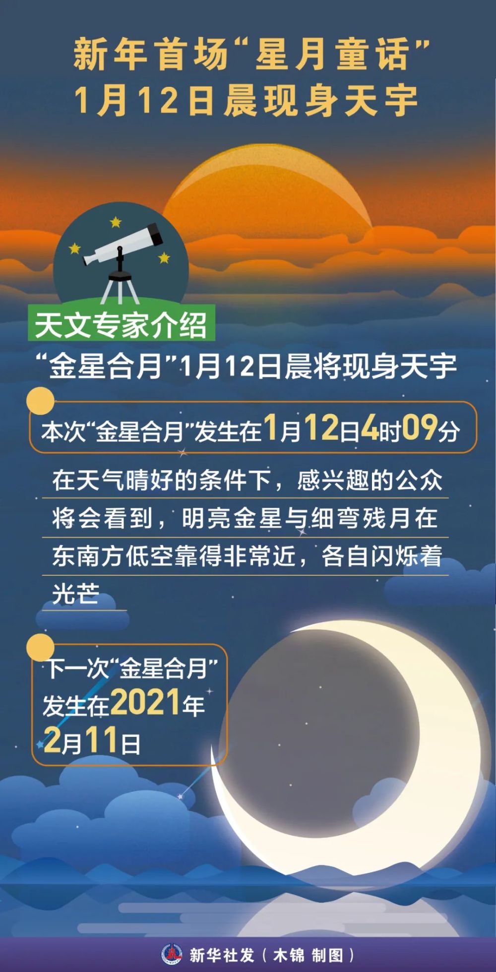 天文专家介绍,作为2021年首场“星月童话”,“金星合月”1月12日晨将现身天宇。届时,如果天气晴好,日出之前,感兴趣的公众面向东南方低空,凭借肉眼有望欣赏到金星和月牙相依相伴的精彩。