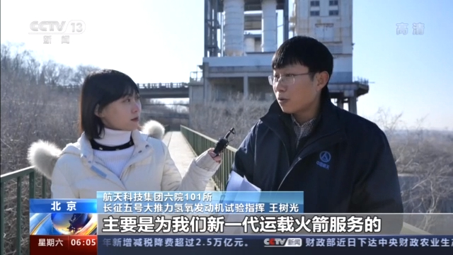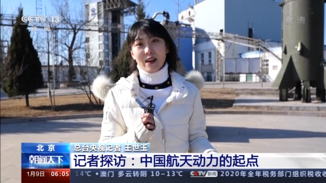 总台央视记者 王世玉 :这里是航天101所,大家可以看到在我身后是东风二号导弹的一个实弹。当年东风二号导弹的全弹试验就是在这里完成的。而完成这个试验的试车台,经过改造之后,正是我们长征五号氢氧发动机的试车台。除了东风二号导弹之外,像我们的东方红一号卫星,北斗、嫦娥系列卫星,以及新一代运载火箭的动力试验都是在这里完成的,所以大家在我旁边的这个纪念碑上看到这写着,这里是中国航天动力的起点。