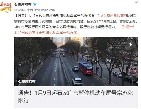 据石家庄发布消息,根据当前石家庄疫情防控形势需要,经石家庄市政府研究同意,自2021年1月9日起,暂停执行机动车每天限行两个尾号的常态化限行措施,限行恢复时间另行通知。