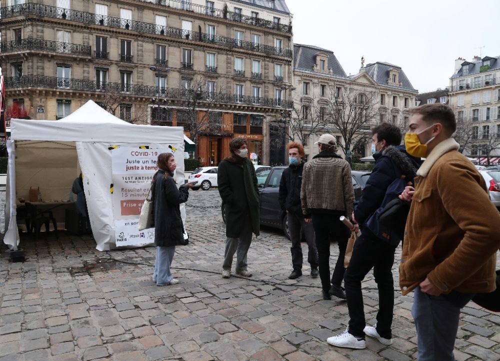 2020年12月16日,在法国巴黎拉丁区,人们在一处新冠病毒抗体快速检测点外排队等候接受检测。(新华社记者高静摄)