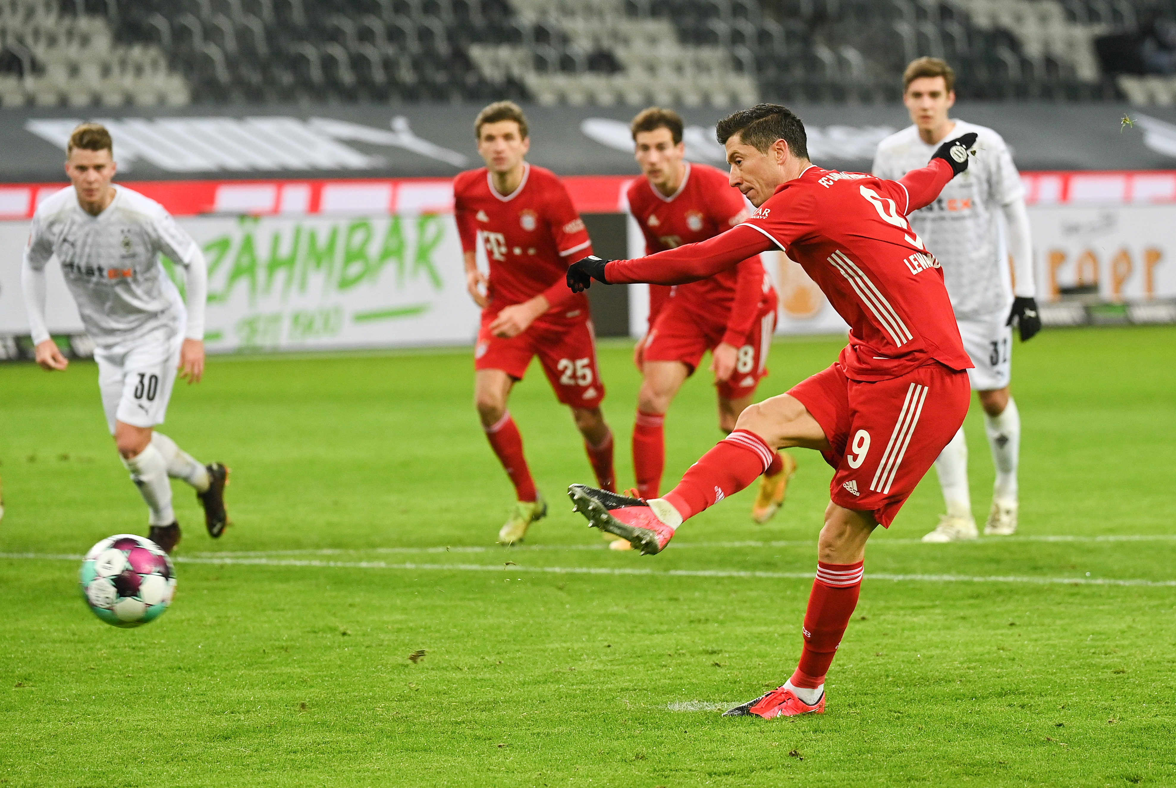 图为拜仁慕尼黑队球员莱万多夫斯基(前)在比赛中罚点球