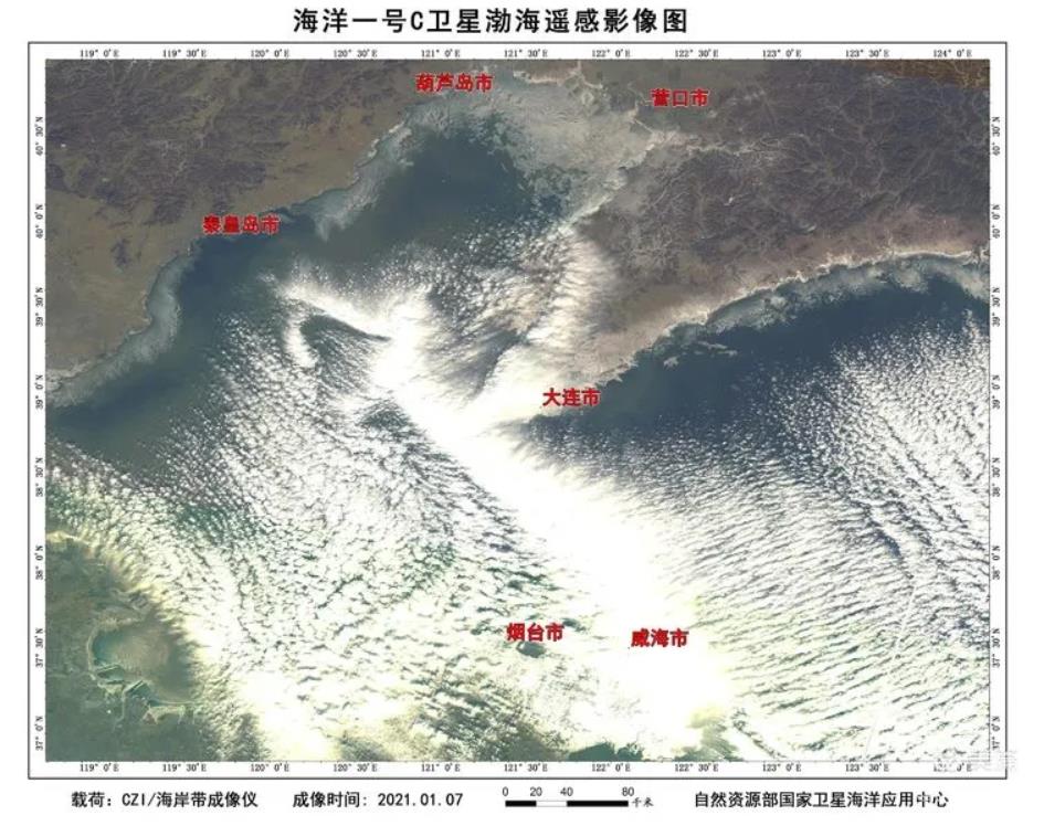 据自然资源部国家卫星海洋应用中心副主任刘建强介绍,从海洋一号C、D卫星海洋水色水温扫描仪获取的云图动画中也可以看到云的移动轨迹,夏季风从海洋吹向陆地,冬季风从陆地吹向海洋。这次寒潮天气过程,西北风强劲,渤海以及黄海上空出现细胞状云系,形成云街像瀑布一样在移动。