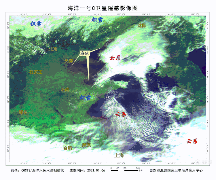 从海洋一号C、D卫星海岸带成像仪图像产品更加直观地看到寒潮过后,渤海沿岸冰情变化较大,都有不同程度地增长。大连、烟台、威海一片普降大雪,白雪皑皑。营口、锦州、葫芦岛、丹东、秦皇岛、唐山、天津、黄骅、潍坊等市的海岸及莱州湾、胶州湾海冰迅速增长。(总台央视记者 李洁 郑天皓)
