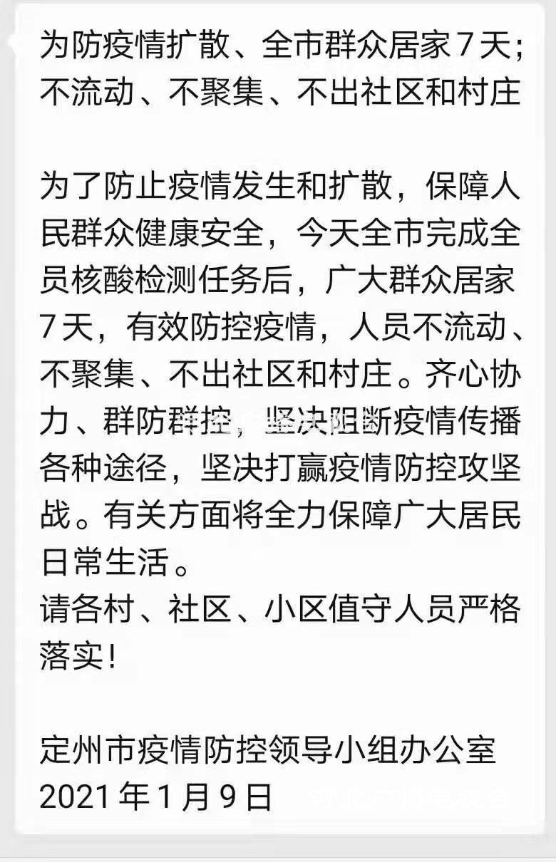 冀时客户端报道(河北台记者 高京原)1月9日,定州市应对新冠肺炎疫情工作领导小组办公室发布消息,今天全市完成全员核酸检测任务后,广大群众居家7天,防止疫情扩散,人员不流动、不聚集、不出社区和村庄。彻底阻断疫情传播途径,保障人民群众健康安全。有关方面将全力保障广大居民日常生活。