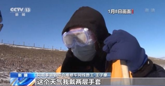 阿勒泰额敏综合维修车间线路工 王子豪:这个天气,我戴2层手套,都得冻透。这还不是最冷的天,这(天气)还好一些比平时。这护目镜,现在你不戴,吹一会你受不了你的眼睛,回去我眼睛也疼,脸也打得疼。这个衣服都是羊皮的,你在这干上一会,都得吹透掉。