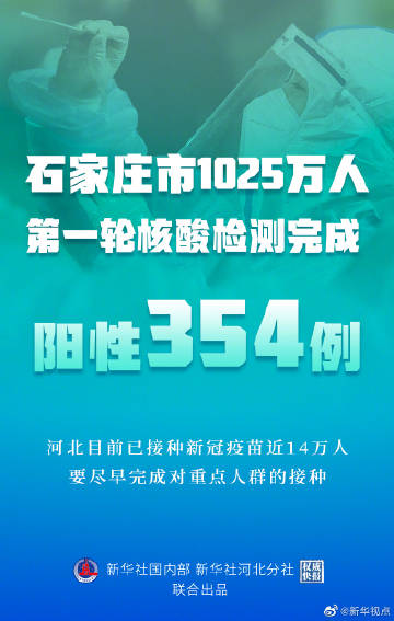 【#权威快报# | 河北#石家庄市1025万人第一轮核酸检测阳性354例#出现社区传播、多代传播】河北省新冠肺炎疫情防控工作新闻发布会9日通报称,石家庄市1025万人核酸检测完成,其中阳性有354例。目前,河北的聚集性疫情发展较快,感染者85.5%来自农村,年龄总体偏大,中位年龄46.5岁,出现社区传播、多代传播。河北已接种新冠疫苗近14万人,要加快进度,尽早完成对重点人群的接种。(记者:王琳琳、彭韵佳、曹国厂)