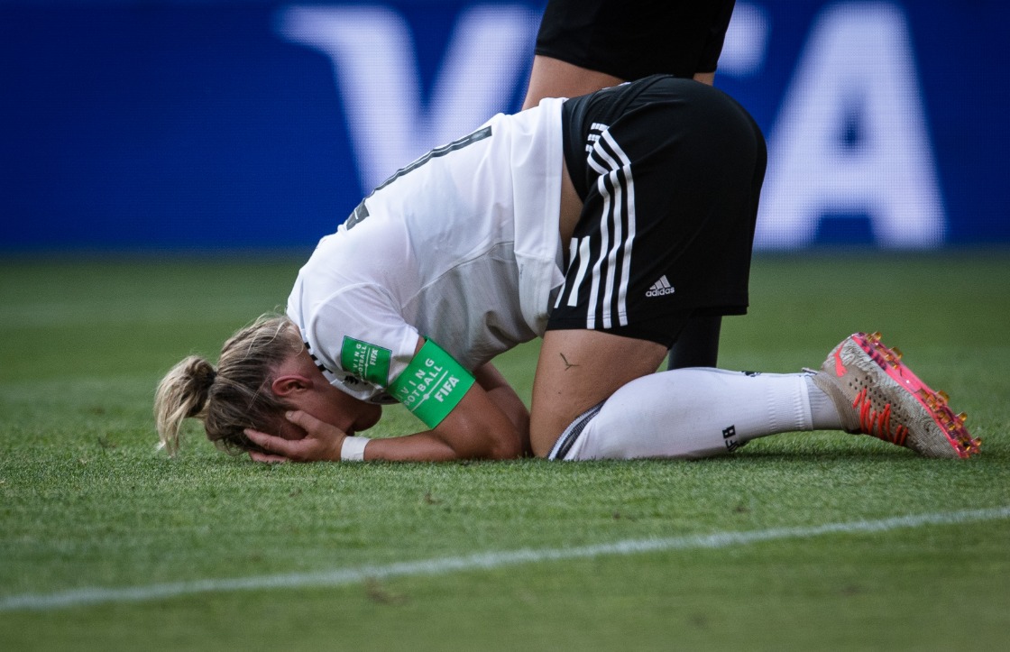 图为2019年女足世界杯,德国队球员波佩在拼抢中摔倒受伤。新华社记者肖艺九摄