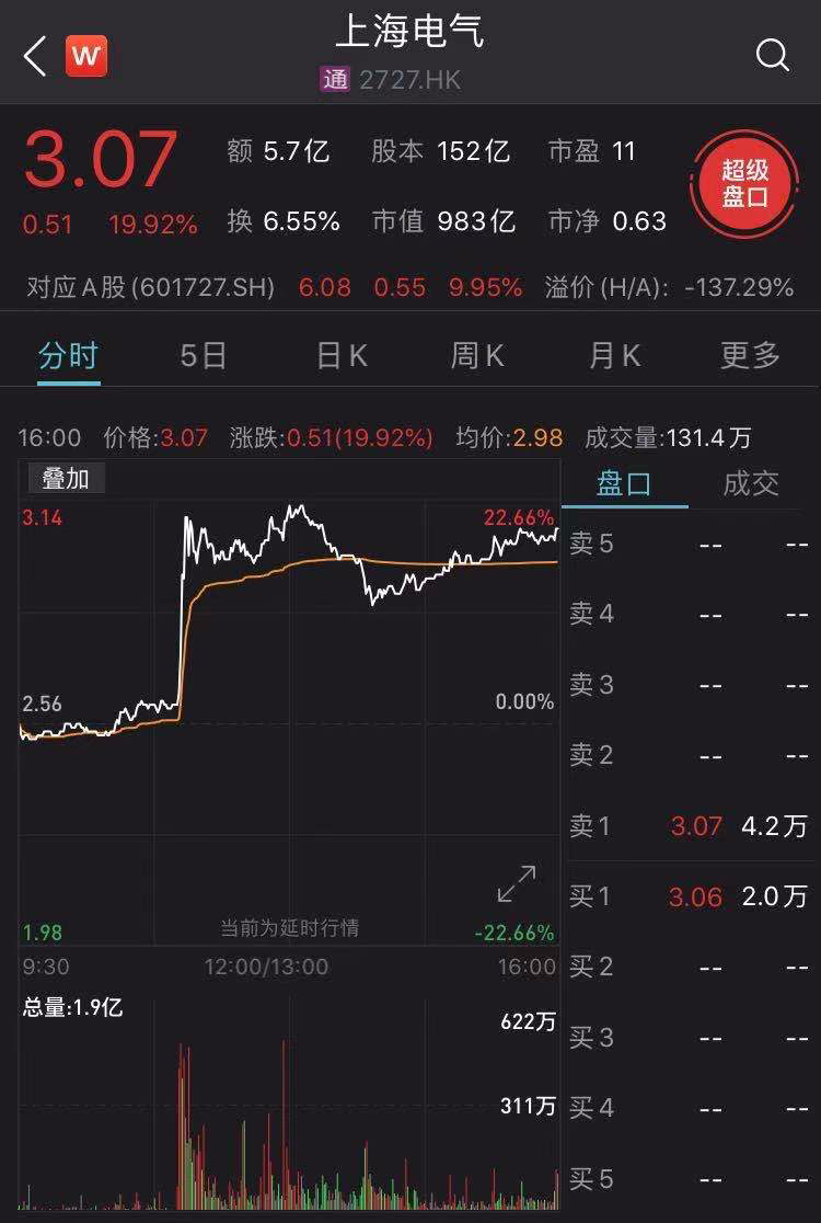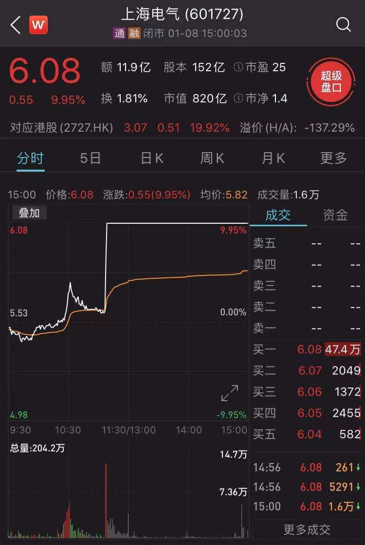 新华社北京1月9日电(中国证券报记者吴科任)1月8日,上海电气A股时隔半年再度涨停,封单47万手,全天成交11.88亿元;其H股大涨19.92%,成交额为5.72亿港元。