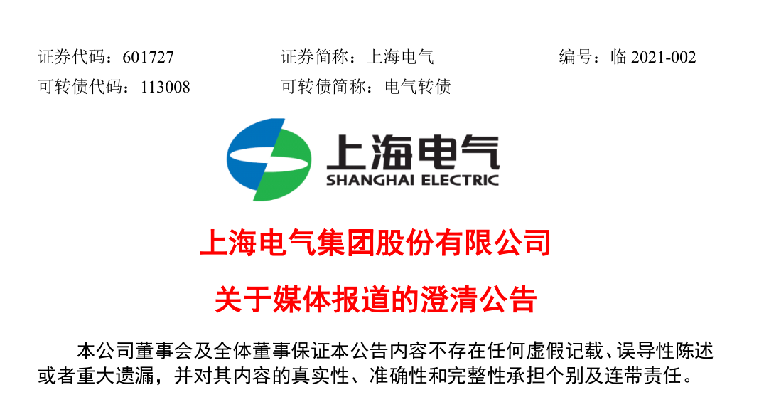 中国证券报记者了解到,上述报道中第二处所称“上海电气”并非指上市公司上海电气,而是上海电气的母公司上海电气(集团)总公司(简称上海电气集团)。根据上海电气A股披露的2020年三季度报告,上海电气集团持有其55.96%股份。