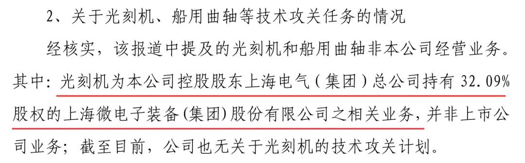 上海电气1月8日晚发布澄清公告称,经核实,上述报道提到的“卡脖子”技术攻关任务中,光刻机和船用曲轴非公司经营业务,公司并无上述业务的技术攻关计划。