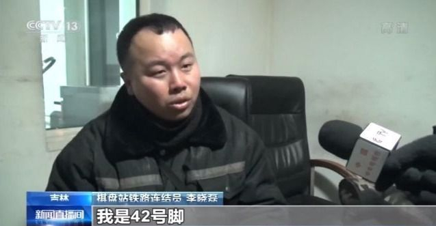 棋盘站铁路连接员 李晓磊:我是42号脚,但是我得穿46号鞋。我们上岗之前都得垫这一个发热鞋垫,垫这个发热鞋垫之后,我们还得穿2双厚袜子,两双厚袜之后呢,我们鞋里面还得放4双鞋垫,放4双鞋垫我们能起到这个防寒作用。