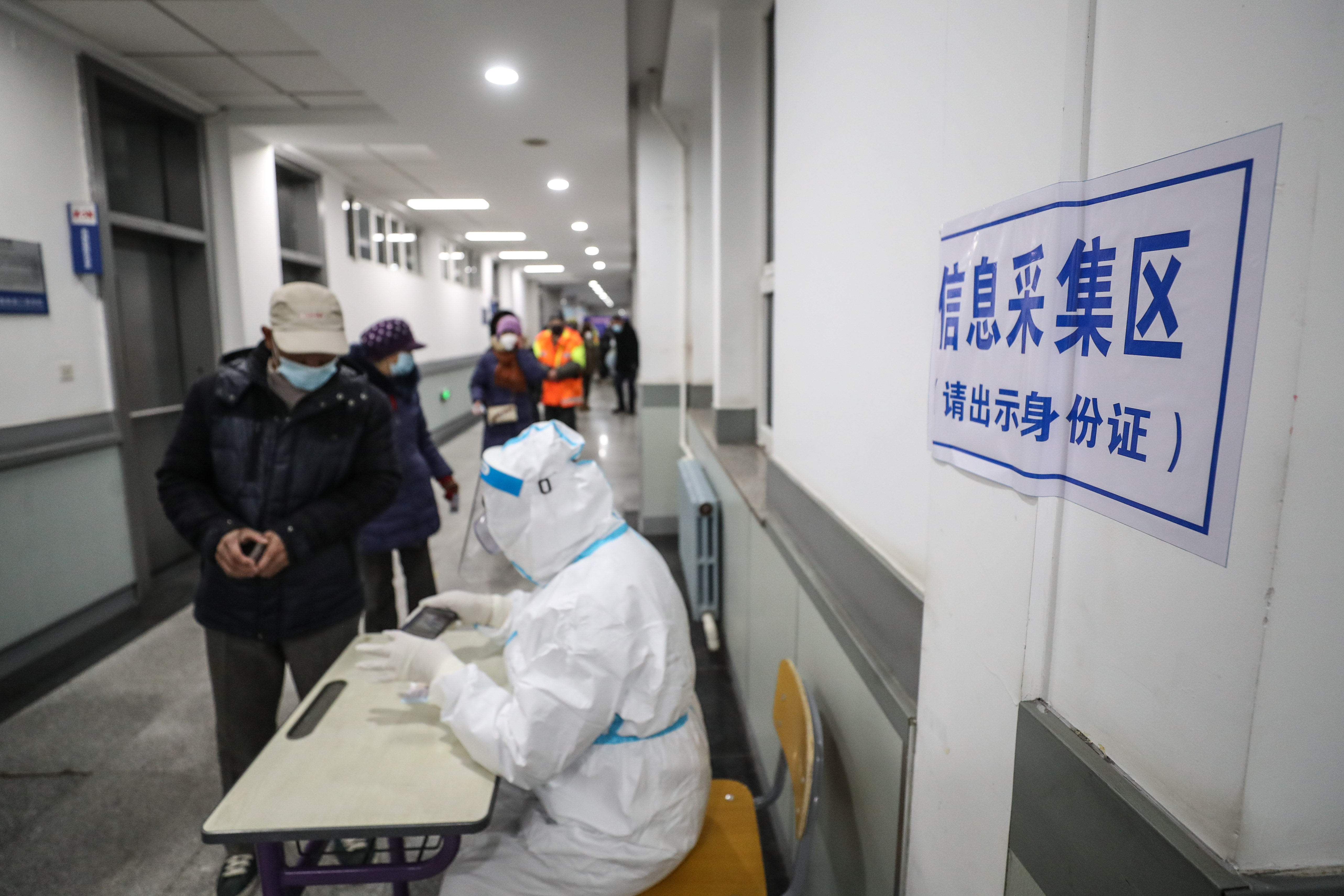 4日,医护人员在沈阳市铁西区重工街道一处核酸采样点为进行核酸采样的市民进行信息登记。(新华社记者潘昱龙摄)
