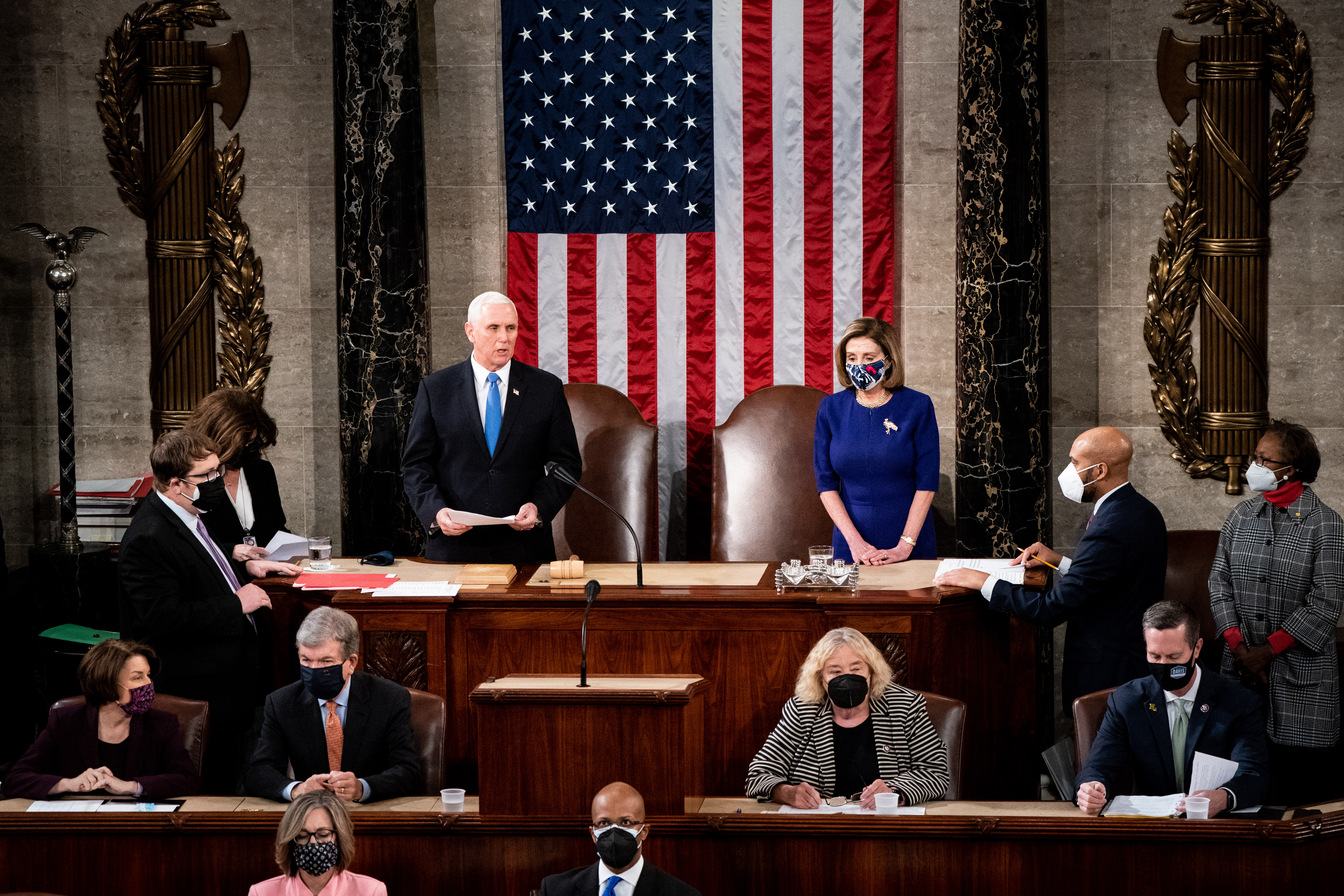 1月6日,在美国华盛顿国会大厦,美国副总统彭斯(后排中左)和国会众议院议长佩洛西(后排中右)出席国会联席会议。美国东部时间7日凌晨,历时近15个小时的美国国会联席会议在经历示威者暴力冲击国会大厦的波折后结束。会议确认,拜登赢得306张选举人票,特朗普获得232张选举人票,拜登当选下一任美国总统。(新华社发,Pool图片,埃林·沙夫摄)