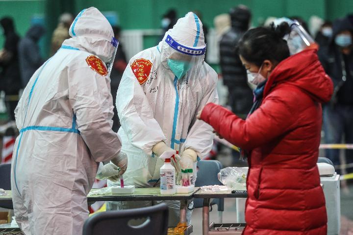 1月6日,医护人员在沈阳市浑南区五三街道塞纳社区(沈阳音乐学院长青校区体育馆)核酸采样点进行核酸采样(新华社记者潘昱龙摄)