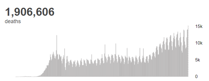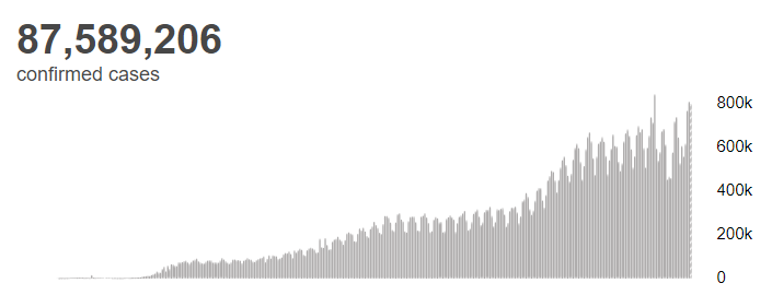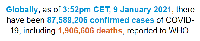 根据世卫组织最新实时统计数据,截至欧洲中部时间1月9日15时52分(北京时间1月9日22时52分),全球累计新冠肺炎确诊病例87589206例,累计死亡病例1906606例。9日全球新冠肺炎确诊病例新增799712例,死亡病例新增15454例,单日新增死亡病例数达到疫情暴发以来最高纪录。