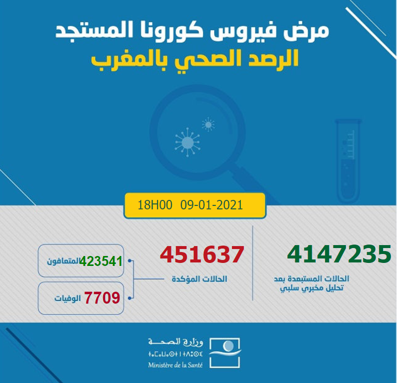 摩洛哥卫生部1月9日证实,该国在过去24小时新增1416例新冠肺炎确诊病例、24例死亡及1469例治愈。截至目前,摩洛哥已经累计确诊新冠病例451637例,死亡7709例,治愈423541例。