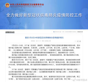 截至1月9日24时,据31个省(自治区、直辖市)和新疆生产建设兵团报告,现有确诊病例588例(其中重症病例16例),累计治愈出院病例82211例,累计死亡病例4634例,累计报告确诊病例87433例,现有疑似病例1例。累计追踪到密切接触者924062人,尚在医学观察的密切接触者26077人。