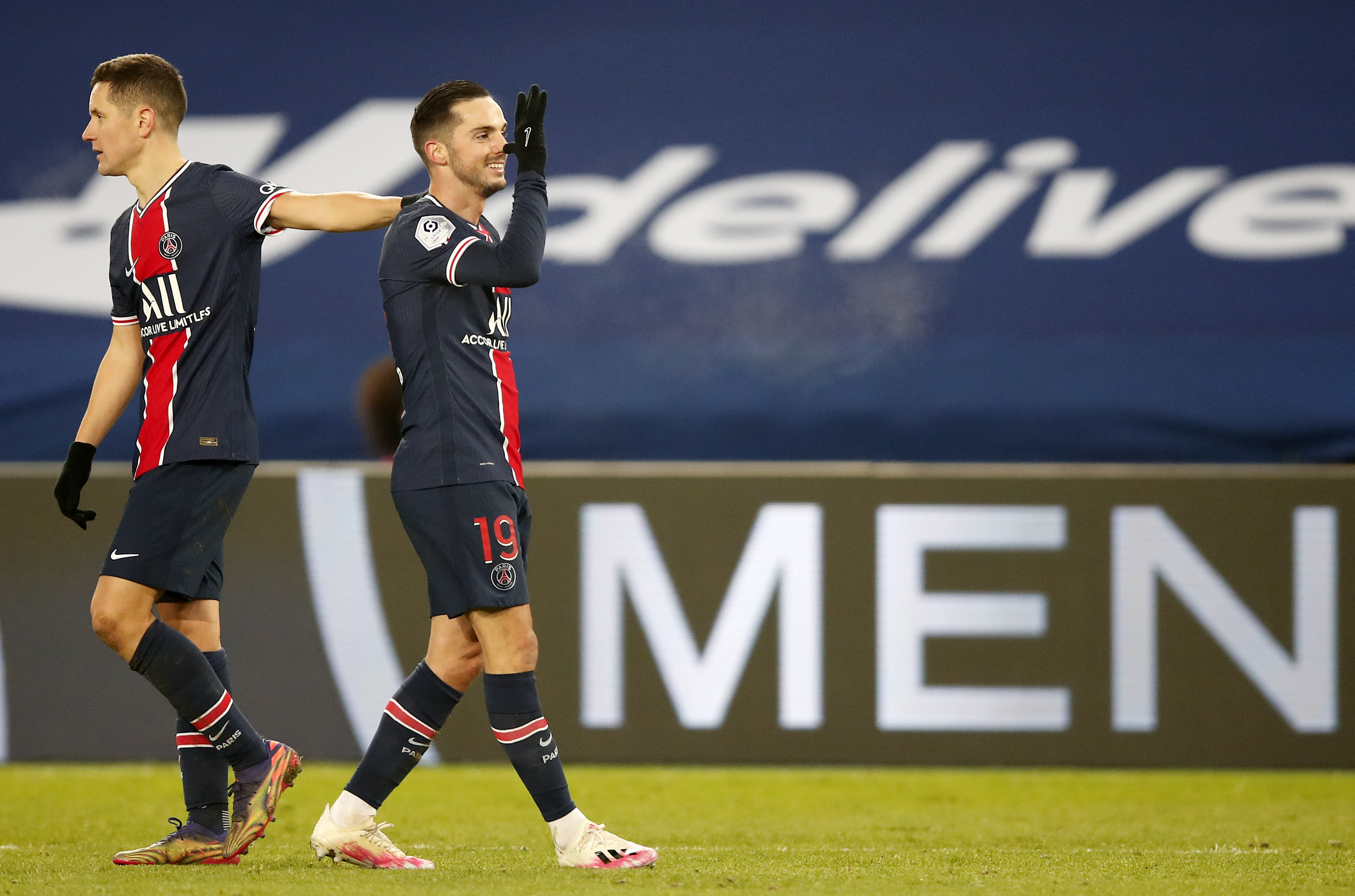 1月9日,巴黎圣日耳曼队球员萨拉维亚(右)庆祝进球。