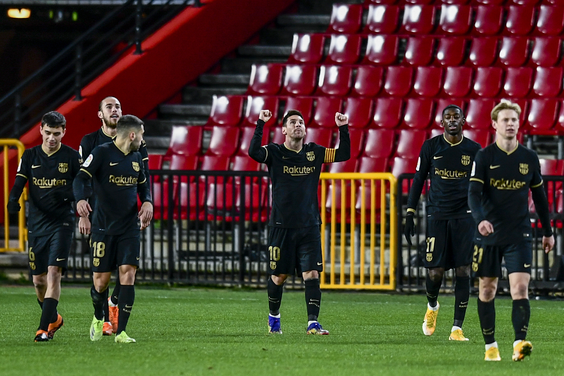 1月9日,巴塞罗那队球员梅西(右三)庆祝进球。