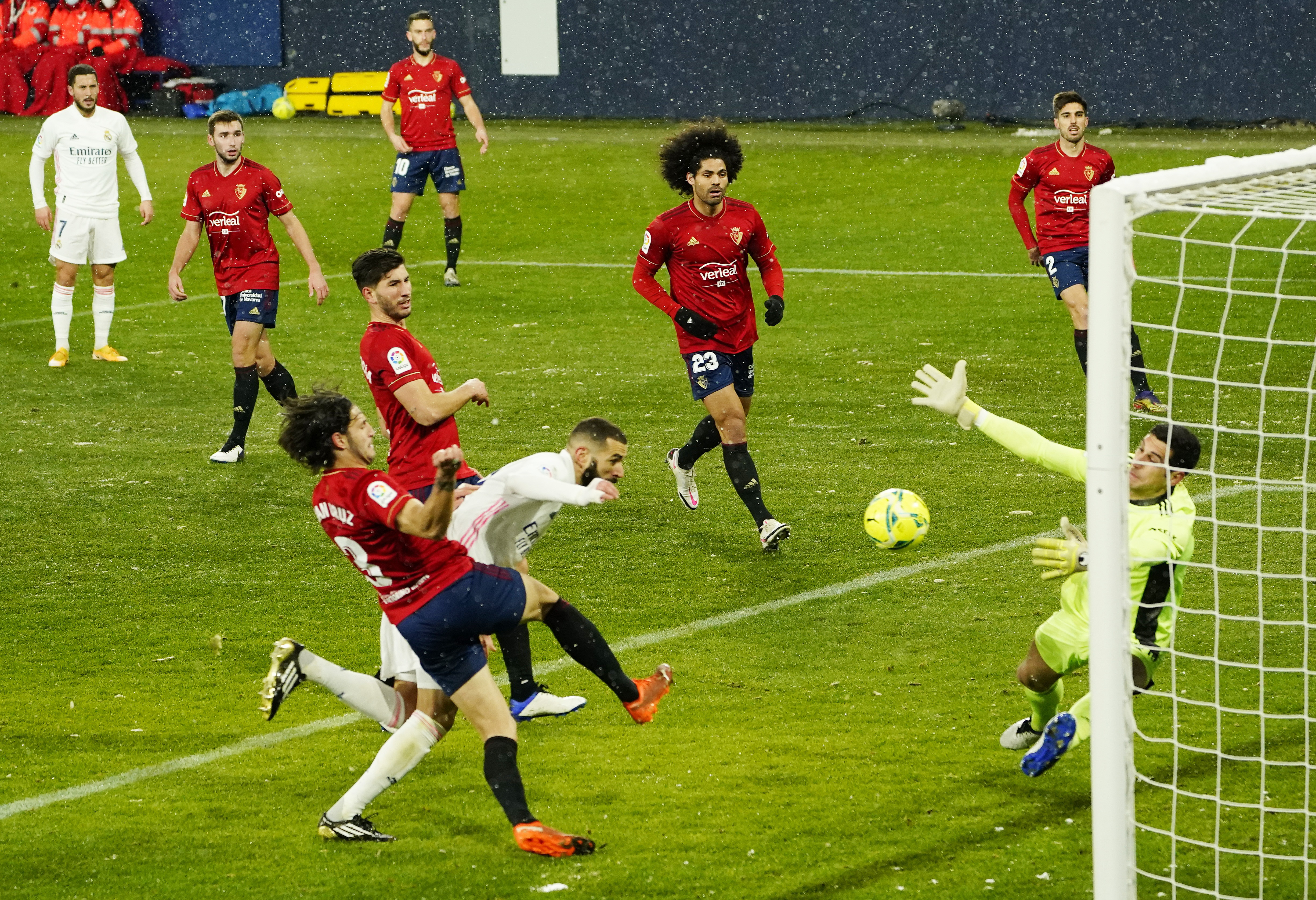 皇家马德里本轮赴潘普洛纳挑战奥萨苏纳。比赛在大雪中进行。“白衣军团”久攻不下,本泽马和拉莫斯分别有一记进球因越位被取消。最终双方0:0握手言和。目前,皇马以11胜4平3负积37分排在积分榜第二位,落后马德里竞技1分。