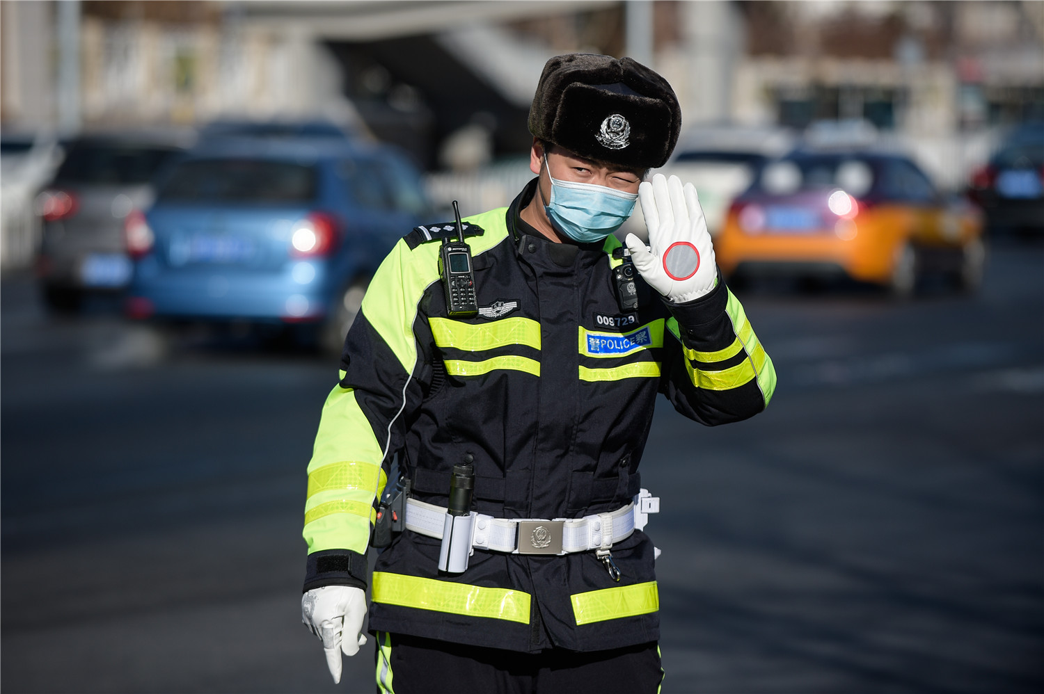1月8日,天坛东路与龙潭路交叉路口,北京东城区交通支队天坛大队警长宋辰飞在执勤。新华社记者 彭子洋 摄