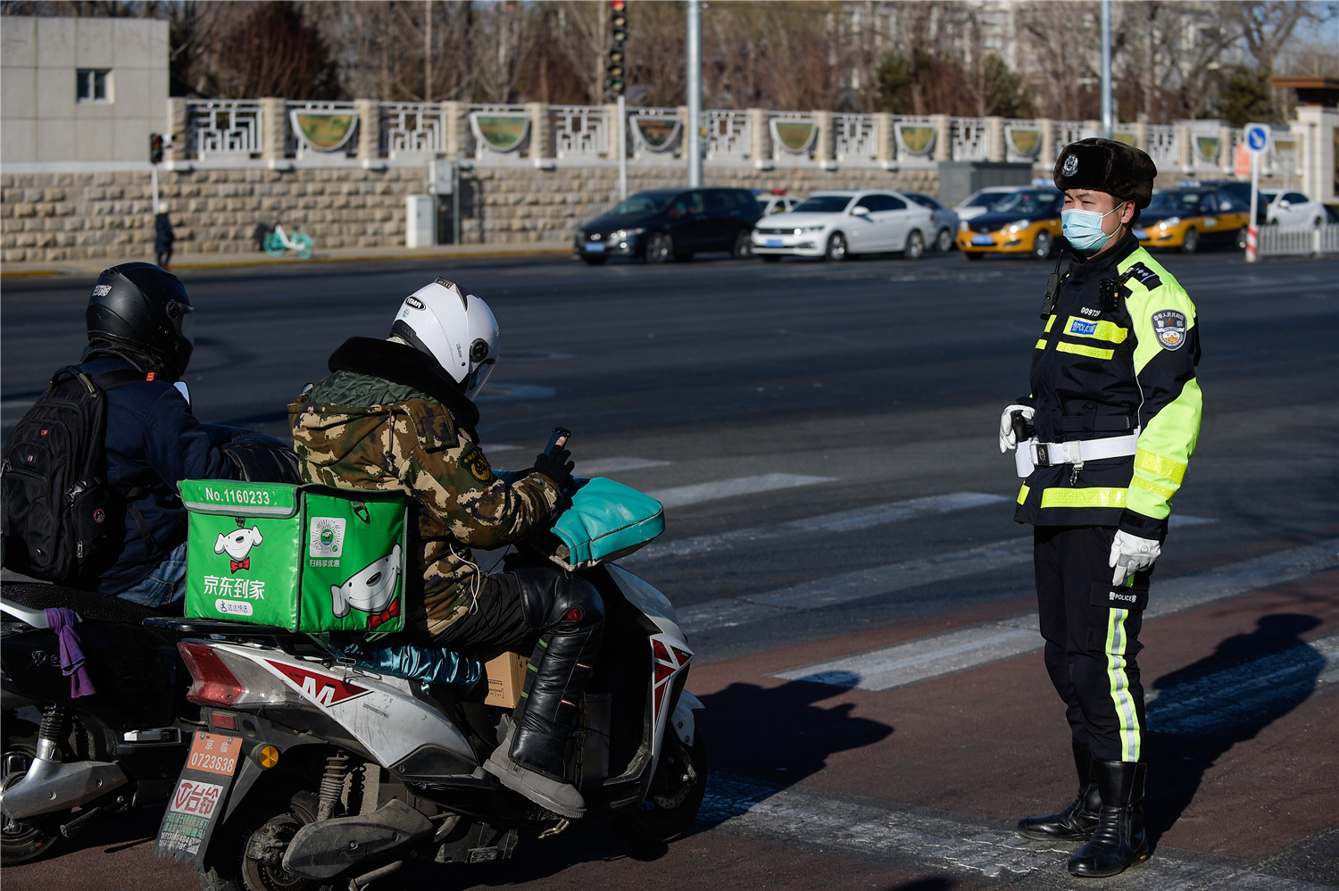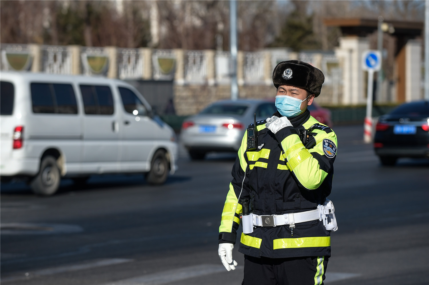 1月8日,天坛东路与龙潭路交叉路口,北京东城区交通支队天坛大队警长宋辰飞(左前)在执勤。新华社记者 彭子洋 摄