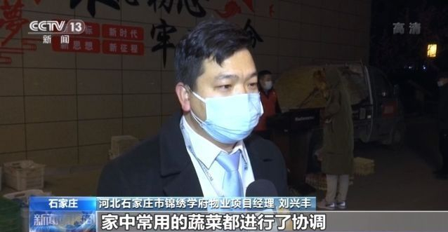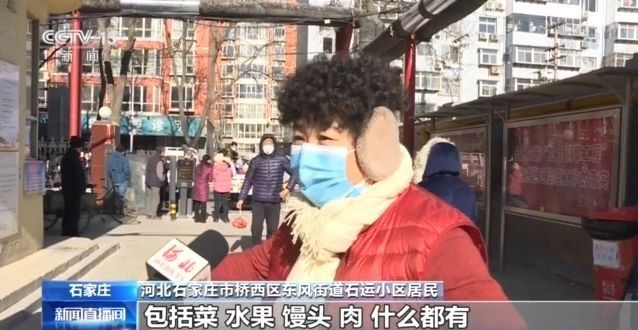 河北石家庄市桥西区东风街道石运小区居民:刚开始,我们还担心这一大家子人出不去上哪买吃的买喝的,早晨起来一看咱们社区的办事处把菜送到门口儿,你看这菜多新鲜。包括菜水果馒头肉,什么都有。