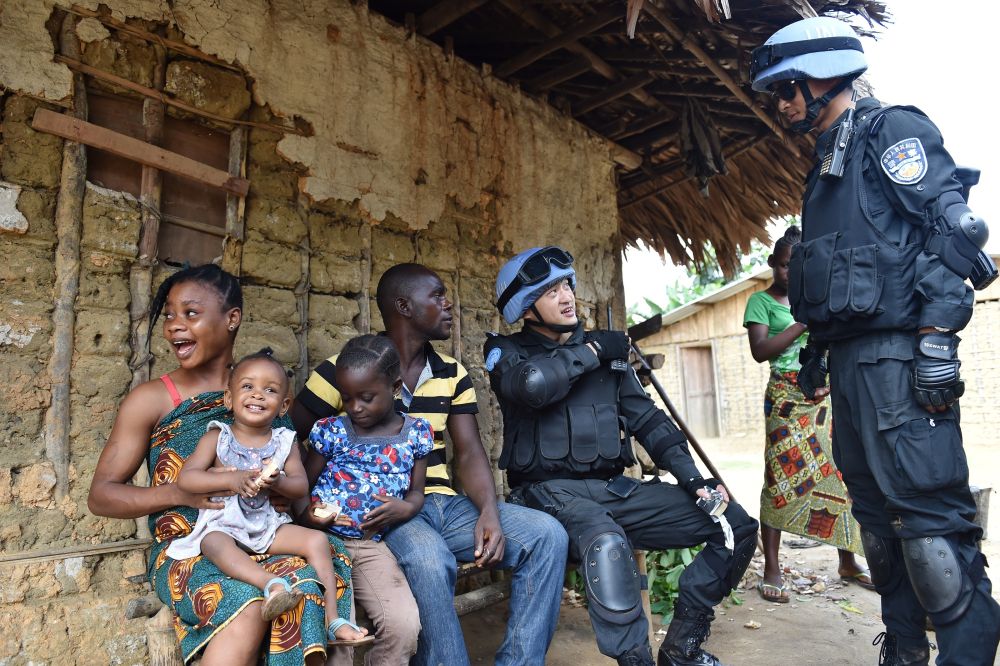这是2015年11月3日,在利比里亚格林维尔一座村庄,中国维和警察防暴队队员询问近期治安等情况。新华社记者孙瑞博摄