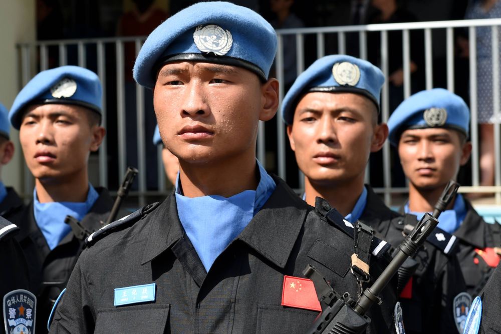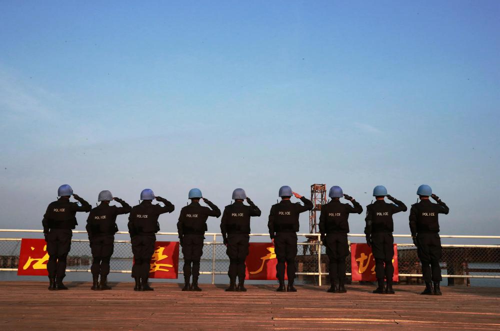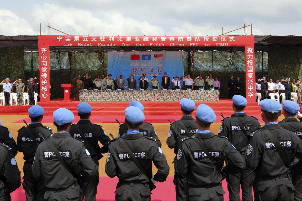 2016年在利比里亚首都蒙罗维亚,中国第四支驻利比里亚维和警察防暴队接受检阅。新华社发(郑志刚摄)