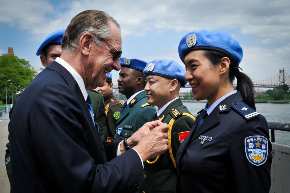 这是2014年5月29日,在纽约联合国总部举行的国际维和人员日纪念活动上,时任联合国常务副秘书长埃利亚松(左)为一名中国维和警察佩戴奖章。新华社记者牛晓雷摄