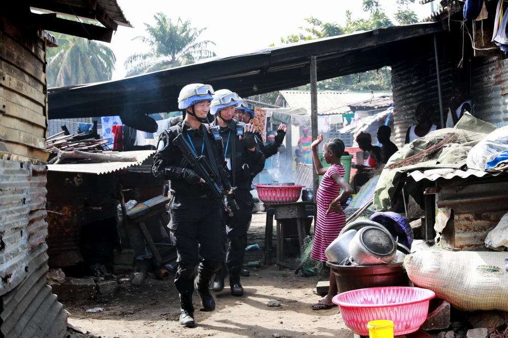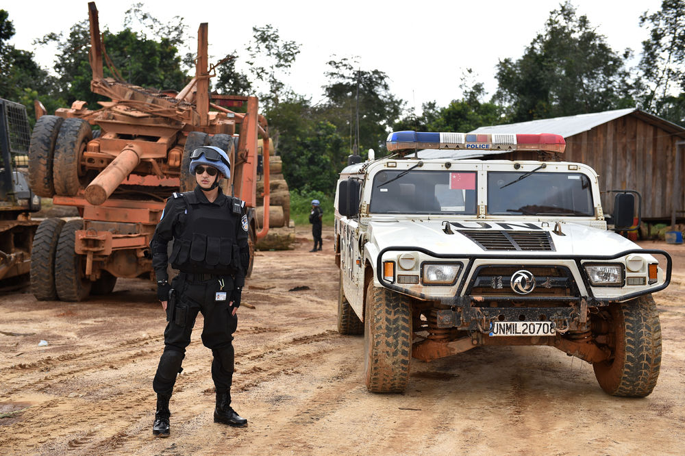 2015年4月2日,在利比里亚希诺州,中国第三支驻利维和警察防暴队员执行联合巡逻任务。新华社发(由永怀摄)