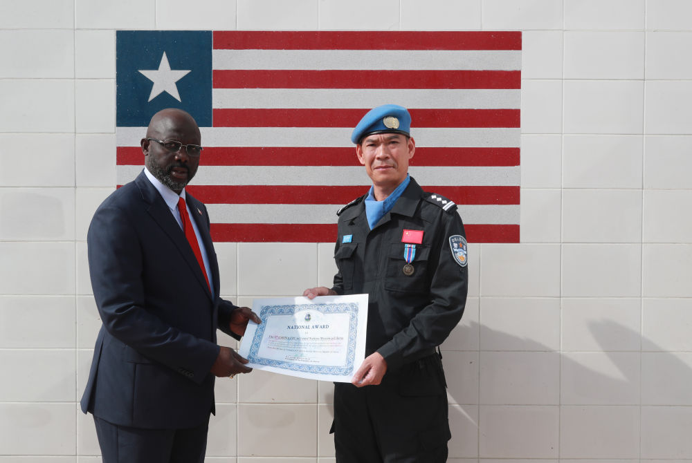 2018年2月28日,利比里亚总统乔治·维阿(左)在首都蒙罗维亚向中国第五支驻利比里亚维和警察防暴队代表颁发国家奖证书。新华社发(赵小新摄)