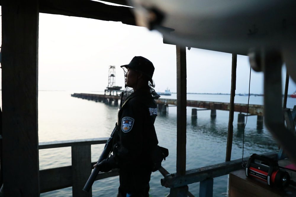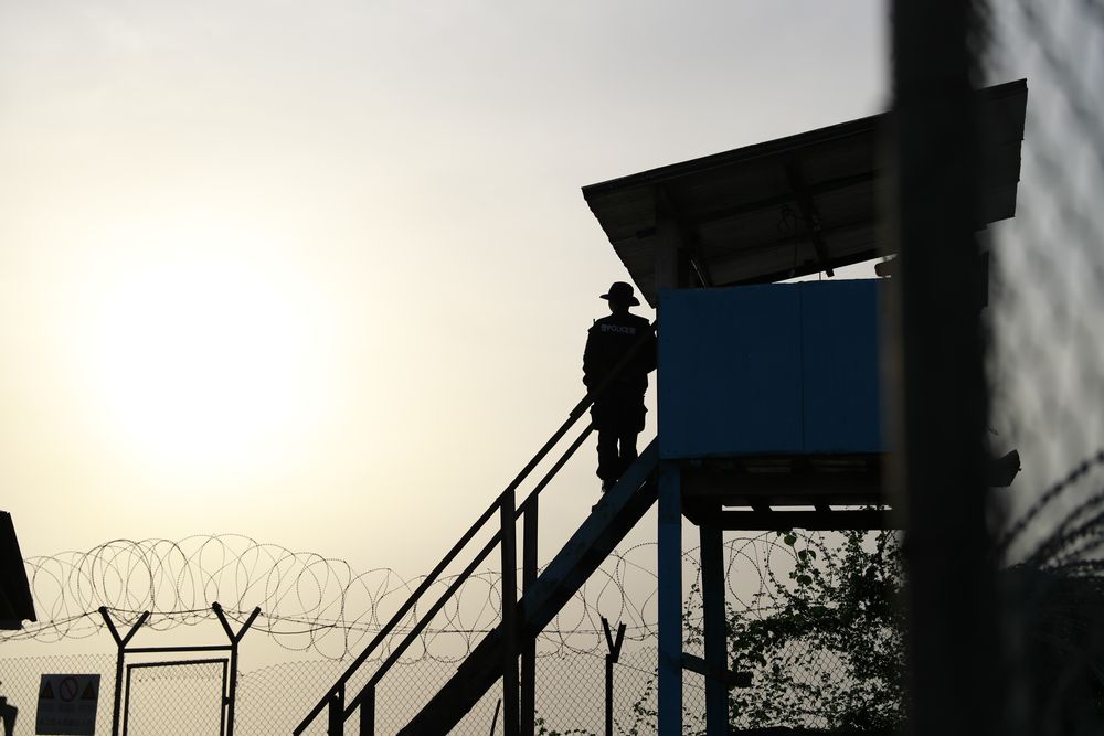 2017年3月26日,在利比里亚蒙罗维亚中国维和警察防暴队营区,一名队员站岗执勤。新华社发(赵小新摄)