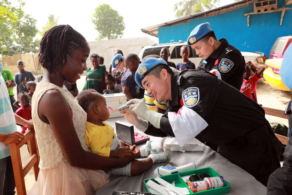 这是2017年12月28日,在利比里亚蒙罗维亚,中国第五支驻利比里亚维和警察防暴队派出医护人员为本森威尔社区孤儿院的儿童和员工进行义诊。新华社发(赵小新摄)