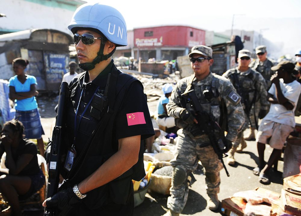 这是2010年1月28日,在海地首都太子港,受联合国驻海地稳定特派团(联海团)指派,一名中国赴海地维和警察防暴队队员(前)与美军士兵在街头巡逻。新华社记者吴晓凌摄