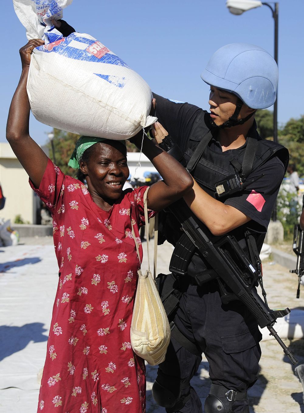这是2010年2月2日,在海地首都太子港的一个粮食发放点,一名中国赴海地维和警察防暴队队员帮助当地居民领取救济粮食。新华社记者吴晓凌摄