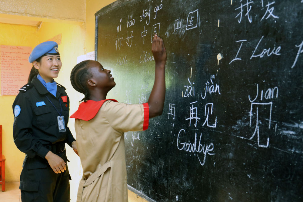 2016年12月20日,在利比里亚蒙特塞拉多州本森维尔,中国第四支驻利比里亚维和警察防暴队队员教当地学生写汉字。当日,中国第四支驻利比里亚维和警察防暴队到蒙特塞拉多州本森维尔市罗莎综合预备学校开展中利友谊共创美好未来——“蓝丝巾”爱心助学活动。队员们与学校师生进行了文化互动交流,并捐赠足球、书包等30余类1000多件文体用品。新华社发(李金良摄)