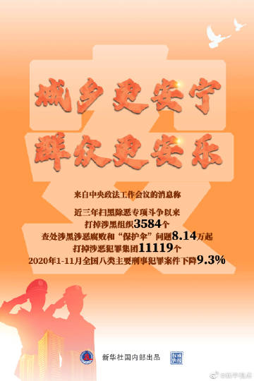 【#权威快报#│这组数据是你我安全感的来源 #全国依法打掉涉黑组织3584个#】让城乡更安宁 ,群众更安乐!来自中央政法工作会议的消息称,截至2020年11月底,全国依法打掉涉黑组织3584个、涉恶犯罪集团11119个,打掉的涉黑组织相当于前10年总和。配合纪委监委查处涉黑涉恶腐败和“保护伞”问题8.14万起,给予党纪政务处分6.81万人,移送司法机关9220人。(记者:刘奕湛、白阳 海报设计:朱舜)