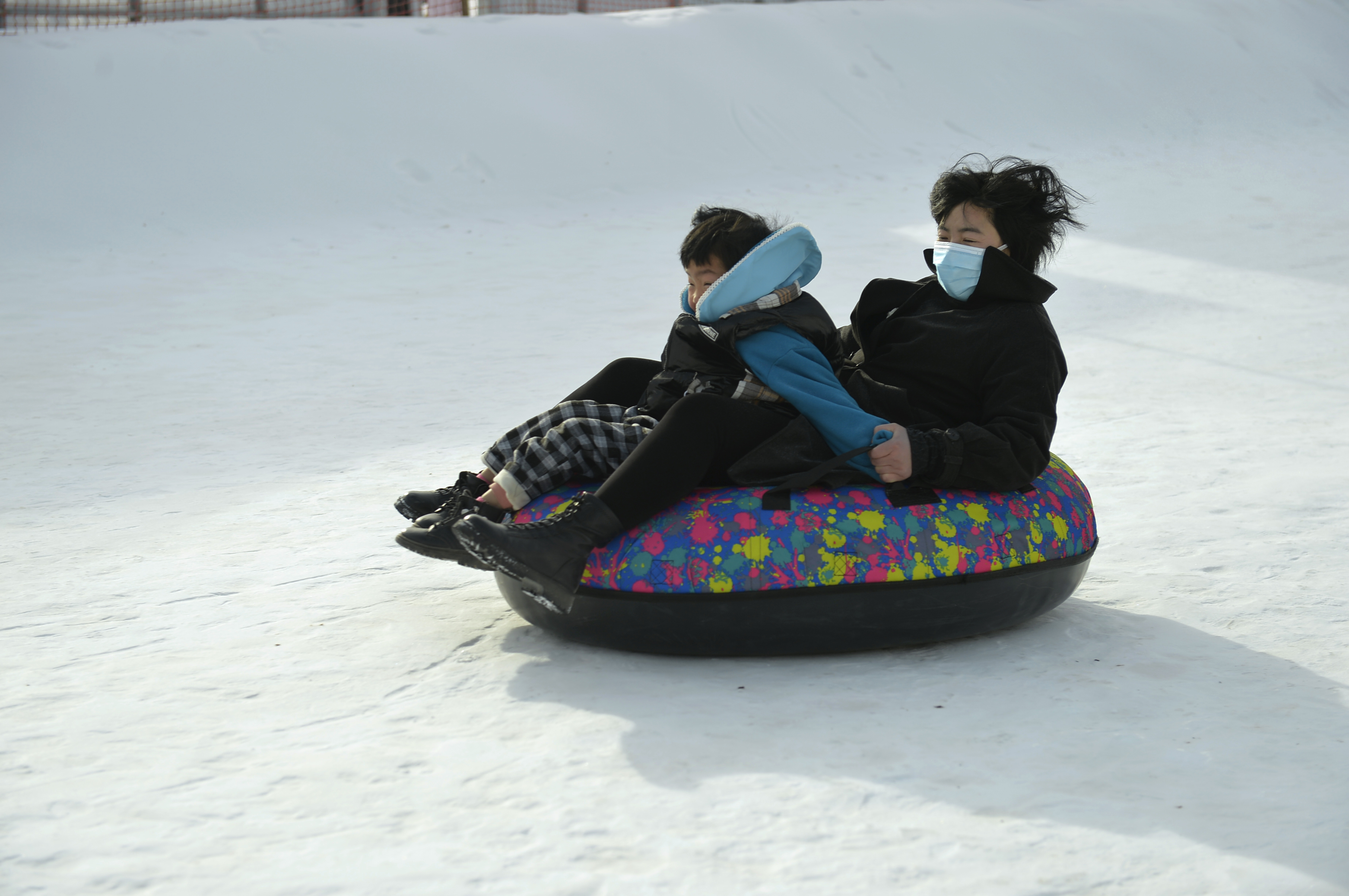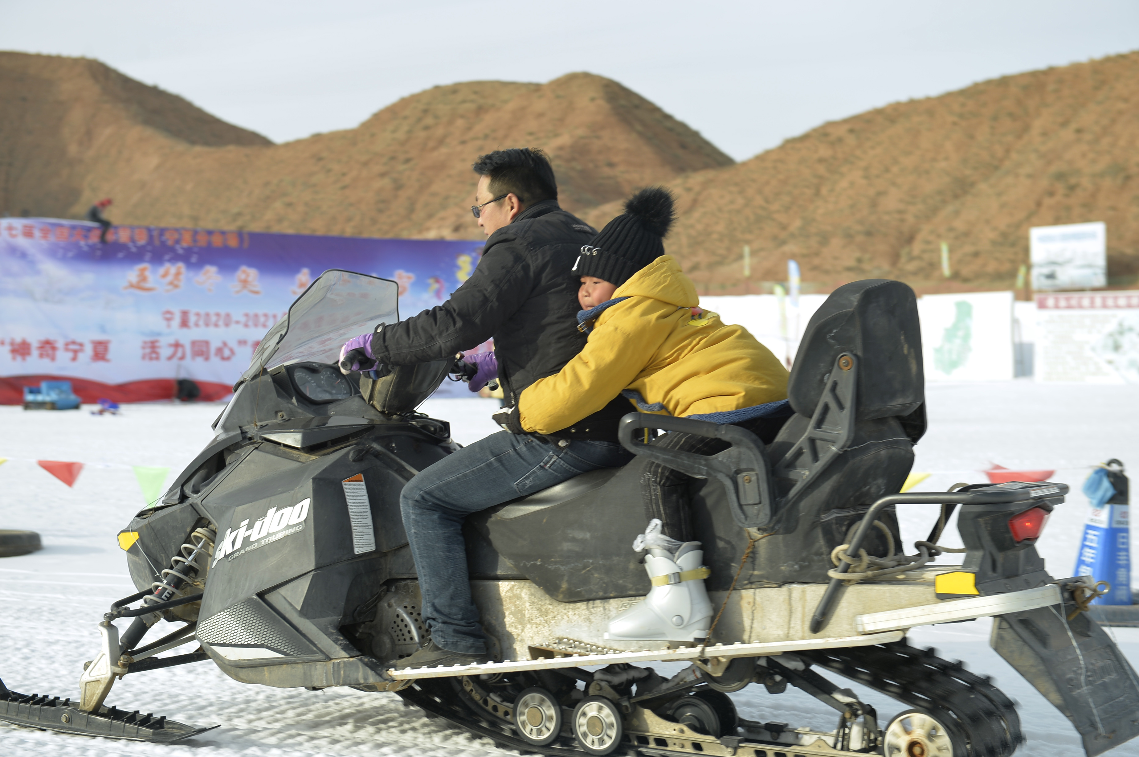 李菊是同心县邻县海原县人,和家人一起开车带着4岁的孩子来滑雪场。她抱着孩子坐在轮胎状的雪圈中,借助重力和惯性滑下六百米长的斜坡。一家人还尝试了滑雪、雪地摩托等项目。