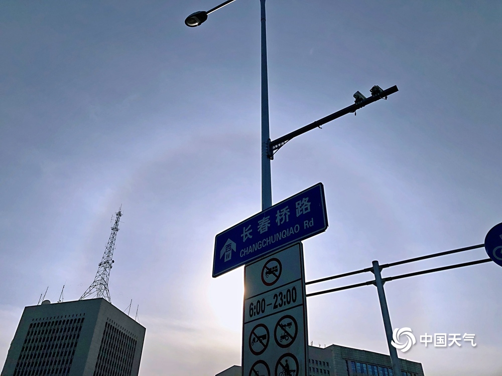 1月10日,北京。14:30许,海淀区西部天空出现日晕现象。太阳旁有一个很大的光圈环绕,若隐若现,肉眼可见光圈宛若彩虹悬于太阳上方,引得无数市民拍照打卡。