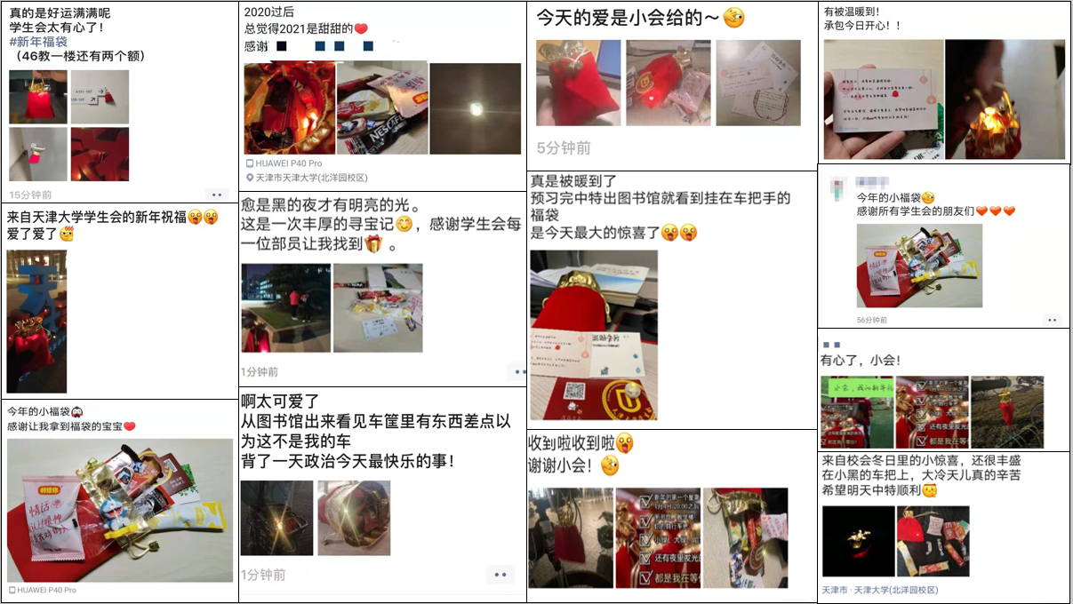 来自天津大学学生会的王浩天是此次活动的策划者之一。日前,学生们化身“温暖派送员”,在校园内发放了600余份暖心福袋。“福袋发出的微光既神秘又浪漫,疫情期间,我们希望为大家的校园生活增添一份乐趣和惊喜。”王浩天说。
