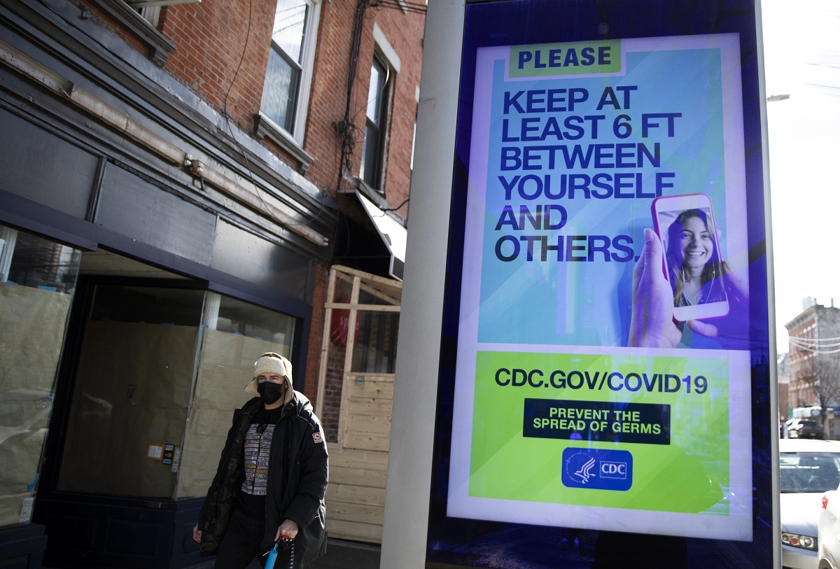 这是1月9日在美国纽约街头拍摄的提醒人们保持距离的告示。(新华社记者王迎摄)
