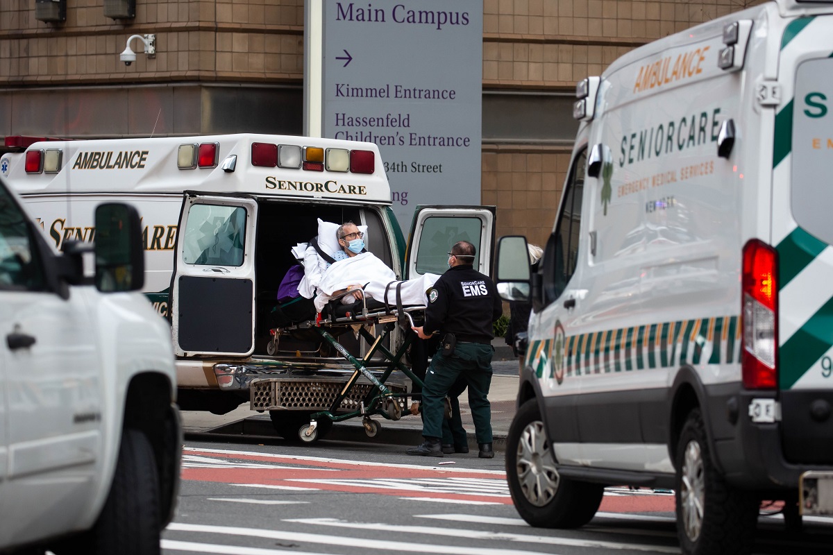 1月8日,在美国纽约一家医院外,医护人员将一名患者送上救护车。(新华社发,郭克摄)