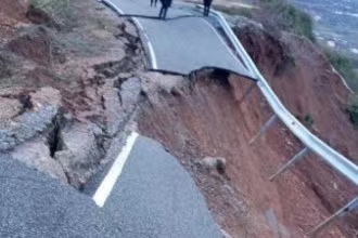 当地两条主要公路的交汇地带,也出现100多米的垮塌。这条公路落成于2013年,由于地处山脚加上维护不善,已经多次因山体滑坡被毁坏。