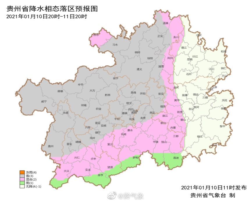 贵州省气象台最新气象预报显示,受低层切变及冷空气补充影响,10日夜间到11日白天,毕节市、六盘水市、遵义市、贵阳市、安顺市、黔西南州大部、黔南州大部、黔东南州西部阴天有雨夹雪或小雪,局地中雪,中西部地区有道路结冰,其余地区阴天转多云。