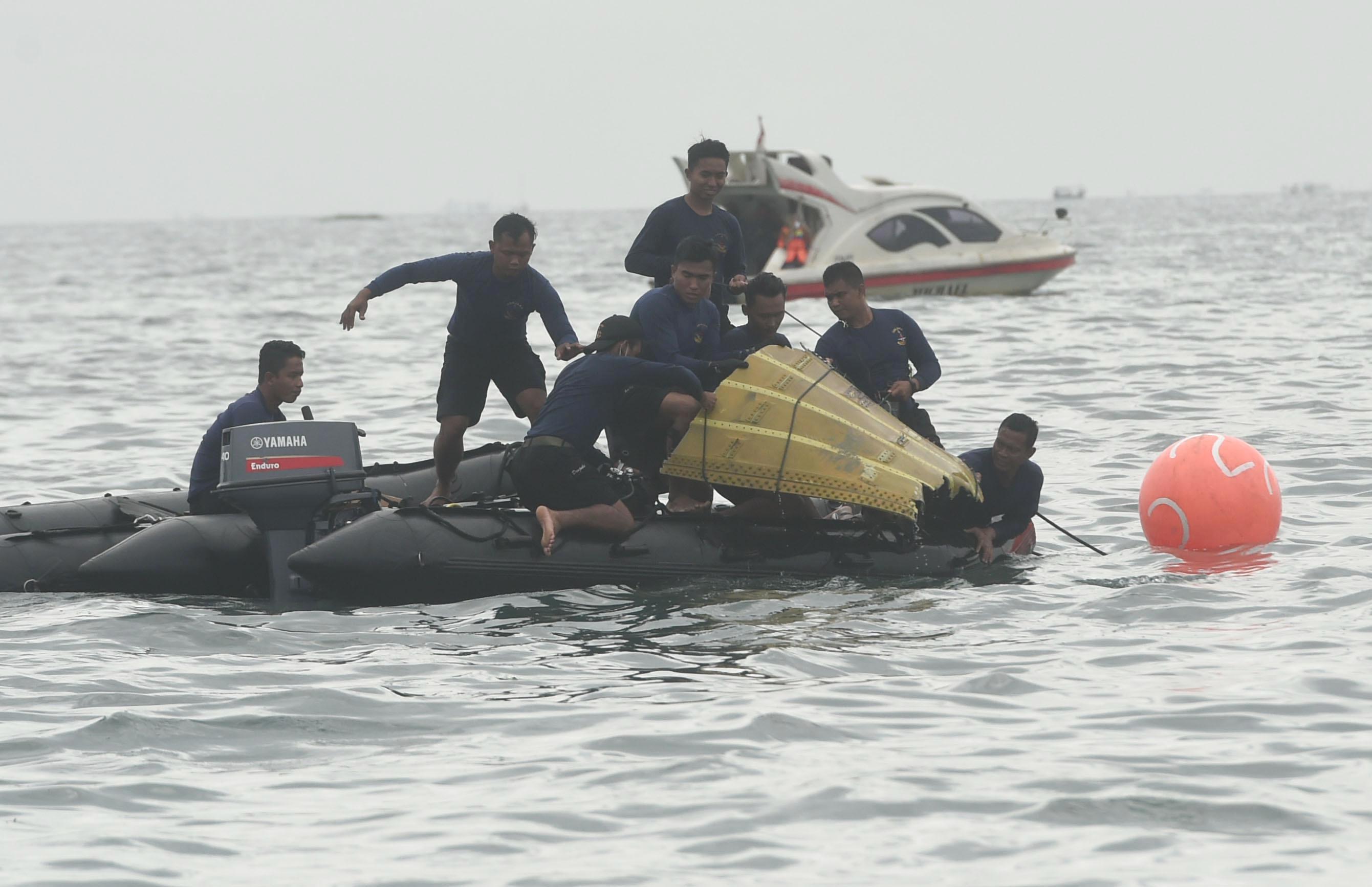 1月10日,印尼搜救人员打捞起三佛齐航空公司坠毁客机的部分残骸。(新华社发,祖卡南摄)
