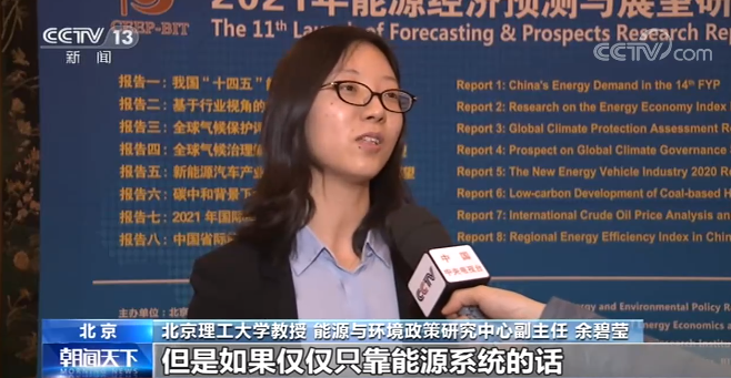 北京理工大学教授、能源与环境政策研究中心副主任 余碧莹:为了实现我们国家碳中和的目标,能源系统的加速低碳转型是关键,但是如果仅仅只靠能源系统的话,那是不够的,我们还需要像产业结构调整,低碳技术的这种加速推广,群策群力才能实现我们碳中和的目标。