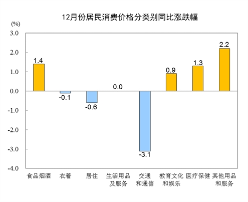 12月份,食品烟酒类价格同比上涨1.4%,影响CPI(居民消费价格指数)上涨约0.44个百分点。食品中,鲜菜价格上涨6.5%,影响CPI上涨约0.17个百分点;鲜果价格上涨6.5%,影响CPI上涨约0.11个百分点;水产品价格上涨1.7%,影响CPI上涨约0.03个百分点;畜肉类价格上涨0.6%,影响CPI上涨约0.04个百分点,其中猪肉价格下降1.3%,影响CPI下降约0.06个百分点;蛋类价格下降10.8%,影响CPI下降约0.07个百分点。