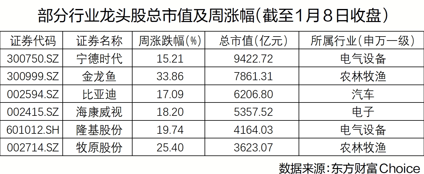 行业龙头表现尤为突出。例如,粮油龙头金龙鱼周涨幅达33%,养殖龙头牧原股份周涨幅为25%,光伏龙头隆基股份周涨幅近20%。宁德时代、比亚迪、海康威视等行业龙头股周涨幅也超过15%。