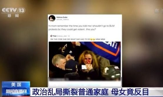 据多家美国媒体报道,一对来自马萨诸塞州的母女本来就因政治立场不同而有矛盾。近日,在网络上目睹了母亲参与冲击国会大厦的视频之后,18岁的女儿海伦娜·杜克在社交媒体上发文,指责自己的母亲虚伪,并对此感到失望。